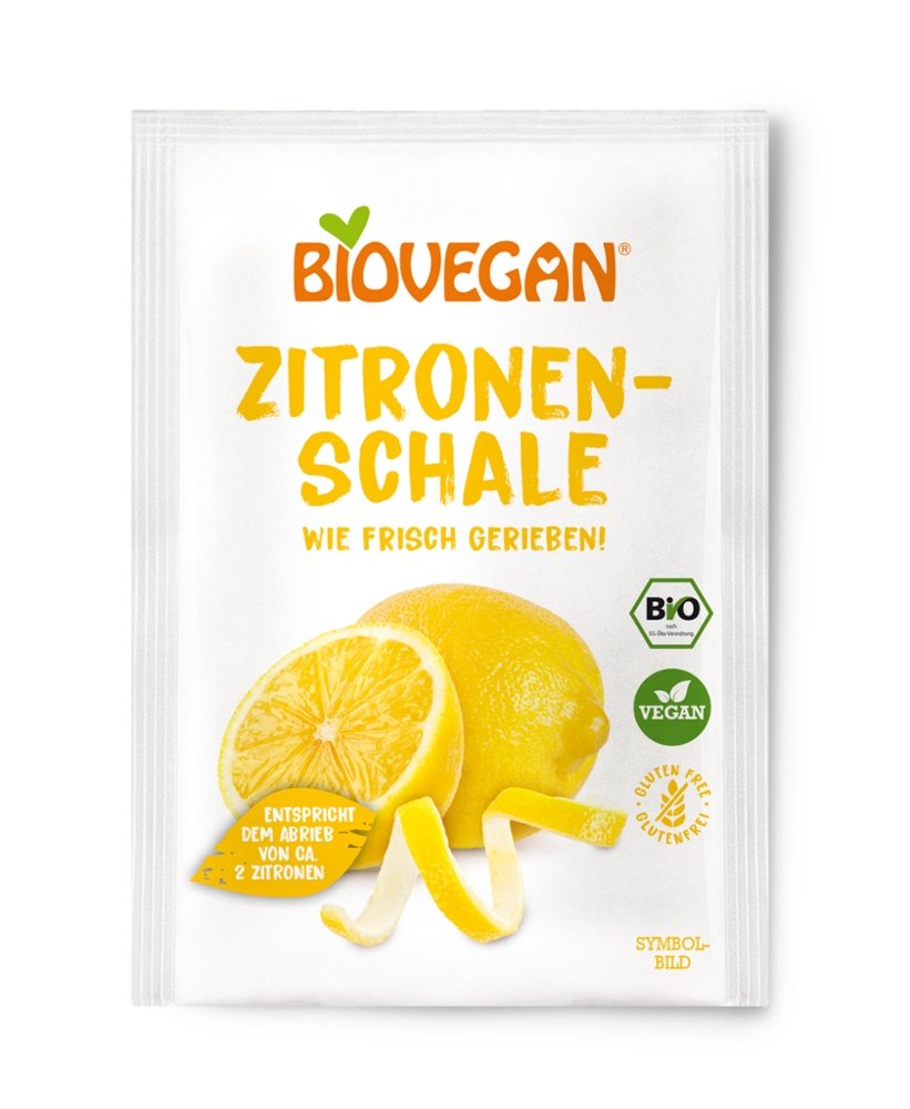 BIOVEGAN Zitronenschale, gerieben, verfeinert mit ihrer Frische und feinen Säure sonnengereifter Bio-Zitronen auf natürliche und biologische Art Kuchen, Gebäcke, Desserts, Saucen und Getränke. Durch die schonende Gefriertrocknung und Verarbeitung der Schale, bei der das natürliche Aroma bewahrt bleibt, garantiert BIOVEGAN eine unnachahmliche Frische und das Aroma fein-spritziger Bio-Zitronen.