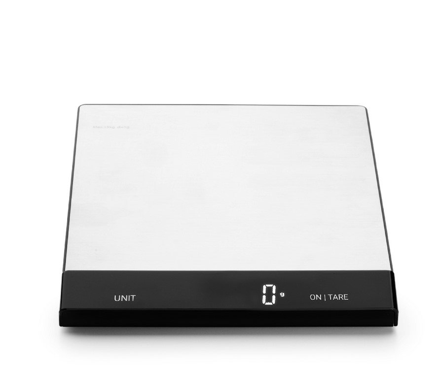 > Hochwertige, große Wiegefläche aus satinierten Edelstahl zum professionellen Arbeiten