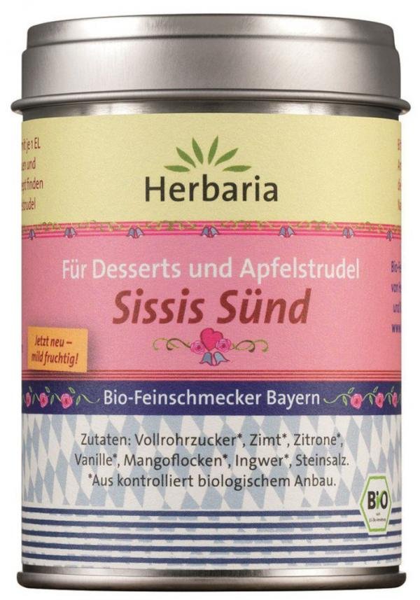 Herbaria Sissis Sünd ist ein Bio-Gewürzzucker für bayerischen Apfelstrudel sowie für Bratäpfeln, Apfelkuchen oder Apfelschmarrn. Dank der tollen Kombination der Zutaten darunter Zimt, Zitrone, Vanille, Mangopulver und Ingwer, schmeckt Sissis Sünd herrlich fruchtig-süß und zaubert damit sündhaft gute Desserts! Sissis Sünd eignet sich für viele Backwaren und Süßspeisen, von Kuchen, über Kekse, für Zimtschnecken oder auch als Topping z.B. auf Quark oder Joghurt.