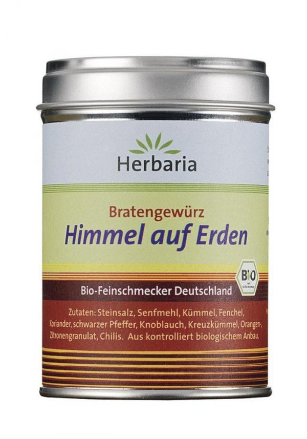 Herbaria Himmel auf Erden ist ein Bio-Gewürzsalz für Rind-, Kalb- und Schweinefleisch als Braten oder Kurzgebratenes. Mit Senf, Kümmel, Fenchel und Koriandersamen schmeckt diese Mischung würzig pikant und ist damit das ideal Gewürz für Bratgerichte der deutschen Küche, aber auch Rote Bete lässt sich mit Himmel auf Erden wunderbar verfeinern.