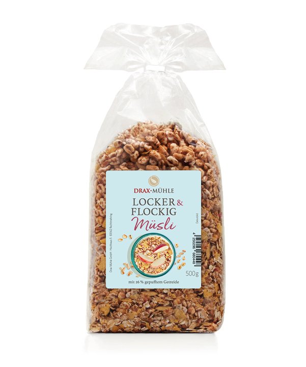 Haferflocken, Cornflakes (Mais, Zucker, Salz, Gerstenmalz), Honig-Dinkel 16% (Dinkel gepufft, Honig), Honig-Weizen 10% (Weizen gepufft, Honig), Gerstenflocken, Trockenfrüchte 6,7% (Äpfel, Himbeeren gefriergetrocknet, Sauerkirschen), Reismehl.