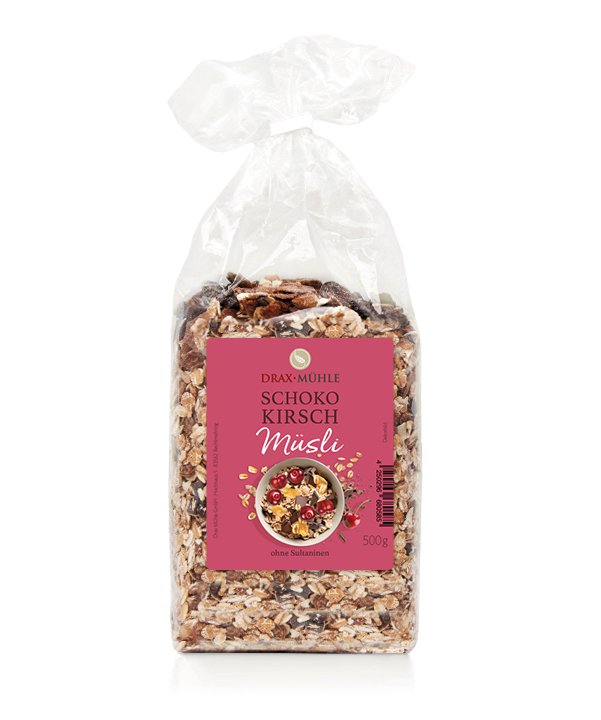 Haferflocken, Weizenflocken, Gerstenflocken, Zartbitterschokolade (Kakaomasse, Zucker, Kakaobutter, Emulgator: Sojalecithin), Cornflakes (Mais, Zucker, Salz, Gerstenmalz), Vollmilchschokolade (Zucker, Kakaobutter, Vollmilchpulver, Kakaomasse, Emulgator: Sojalecithin), Aprikosen getrocknet, Sauerkirschen getrocknet, Äpfel getrocknet, Honig-Dinkel gepufft (Dinkel gepufft, Honig), Honig, Überzugsmittel: Gummi arabicum, Reismehl, Kokosfett, Zimt.